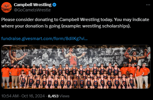 Campbell had funded wrestling big time in the last decade, pushing to hire quality coaches and recruit a lot of wrestlers. Like, more than 50 wrestlers on the roster. You might have noticed the cheering section at Campbell wrestling matches, even away matches. Those aren’t students showing up of the goodness of their hearts. Those are other wrestlers not in the starting lineup.