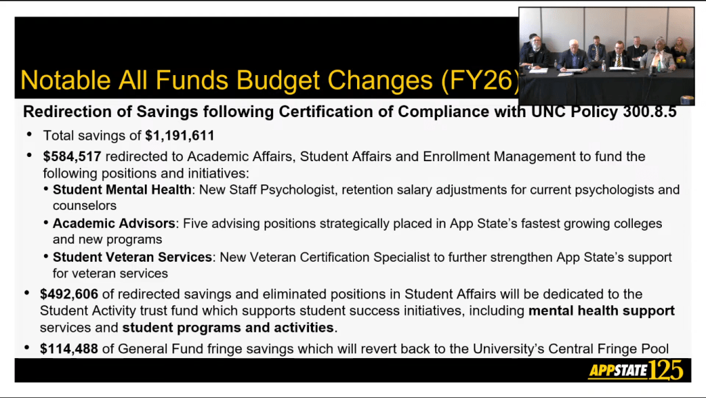 Saved $1.9 million following UNC System policy by eliminating positions and restructurings and putting into student-success initiatives such as mental health, academic advisors, veterans services and more.
