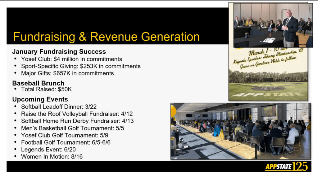 Here are all these revenue-generating opportunities coming up. Mentions Softball Leadoff Dinner sold out, compliments new coach Whitney. Says the record isn’t where we want to be, but notes we’re in a game with top teams in the country.