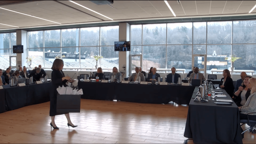 Kathryn Long, Student Government Association Rep, gets to address the board one last time. She’s very bubbly and likable. Says she’s from Northampton County, where only 17% of residents have a bachelor’s degree. She’s tearing up. Says her spirit animal was a butterfly because it changes, but now is kinda afraid of change. I hear ya there.