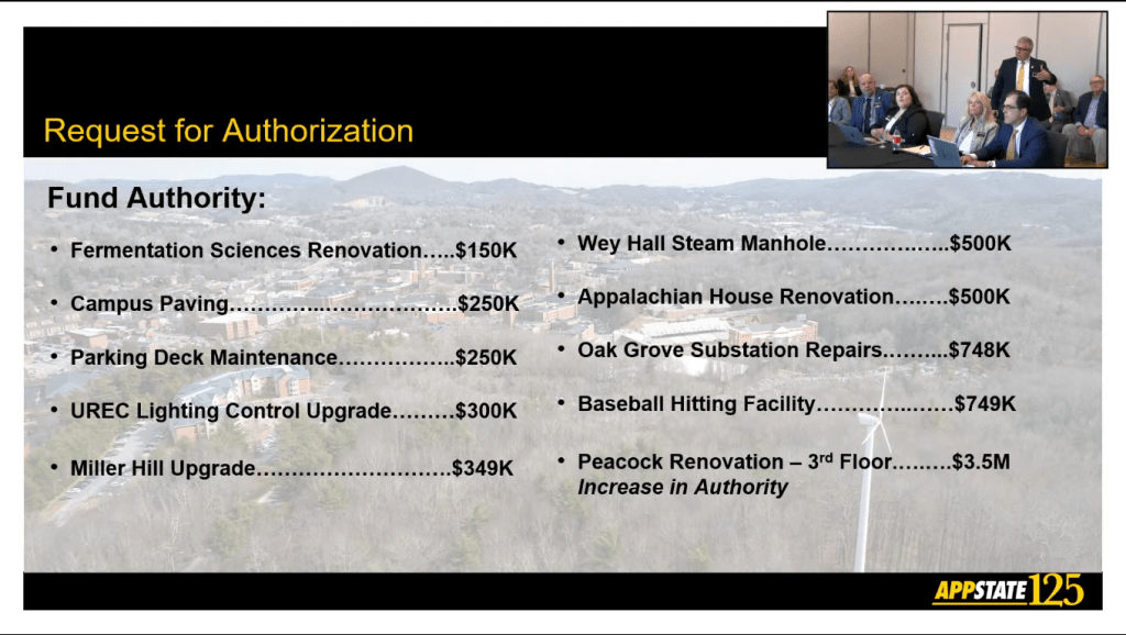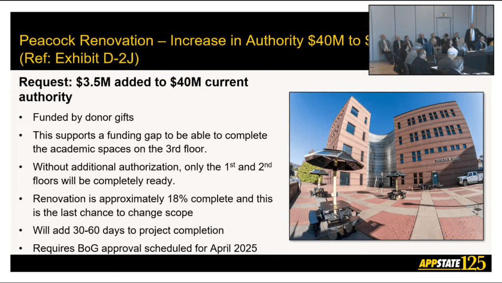 Peacock Hall renovations got more expensive, yet again. This happens like 3 times a year now. The hump gets evermore higher. The UNC Board of Governors has to approve this one. All the others, nope.
