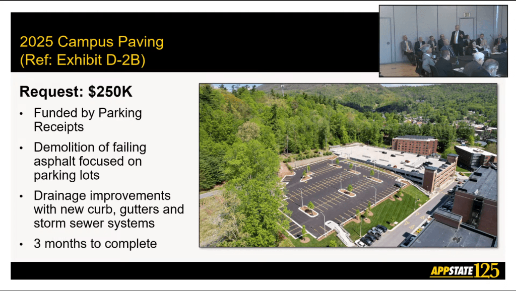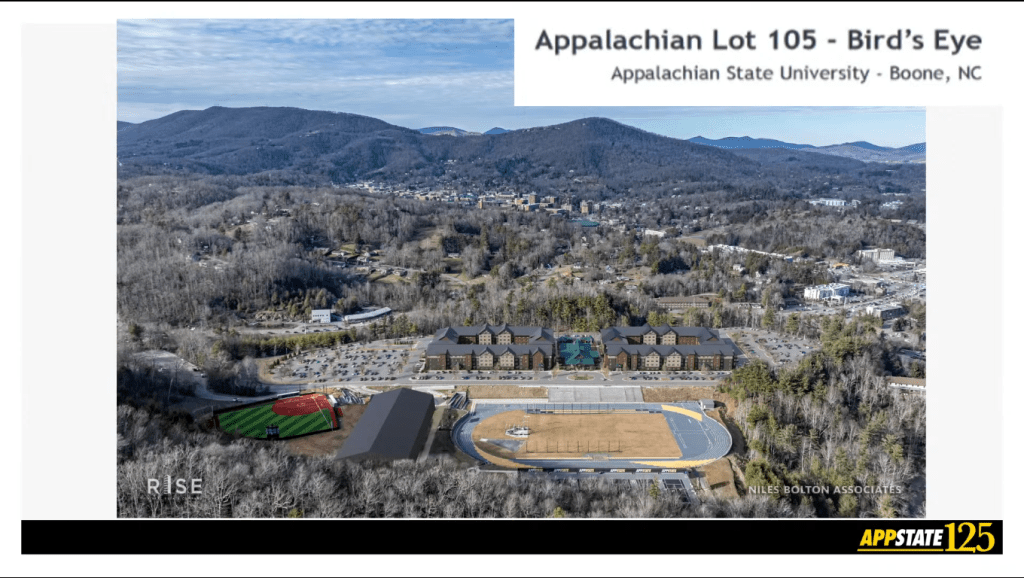 Anita Greene asks what was there before. JJ says it’s a gravel lot right now, with overflow parking and first-year student parking. (it was the site of Watauga High School until the early 2010s, then had an unofficial skate park, then App State bought it).