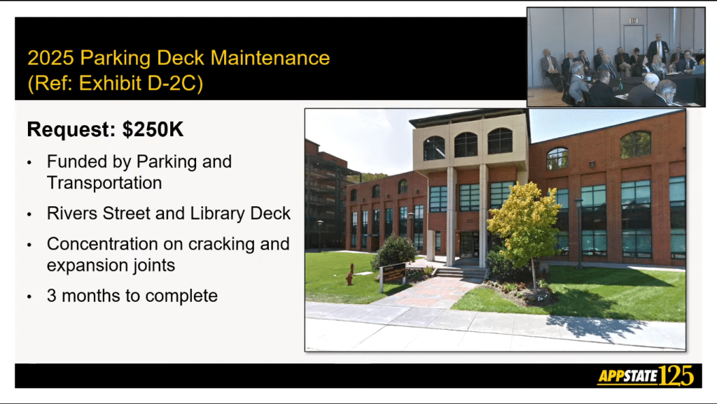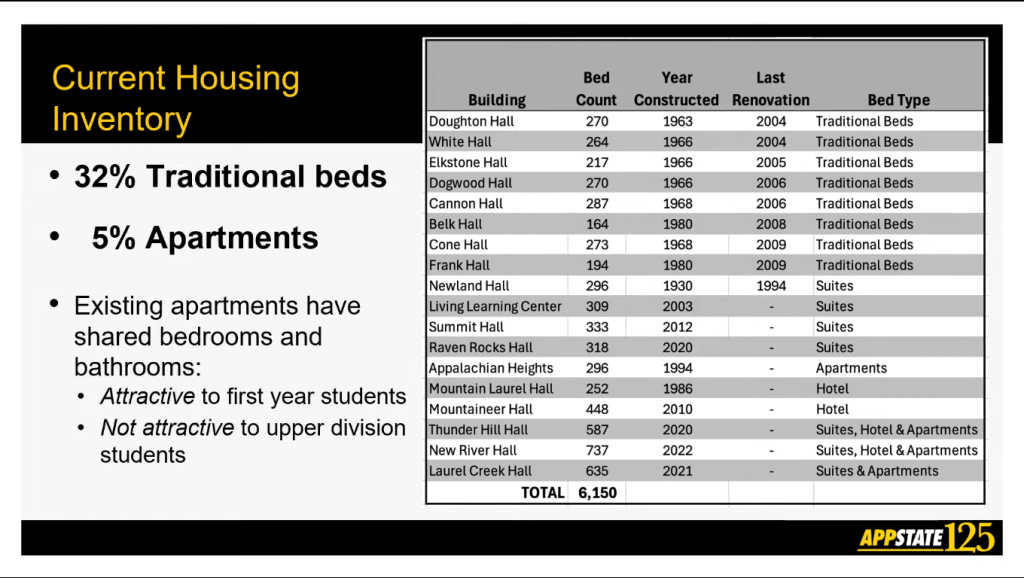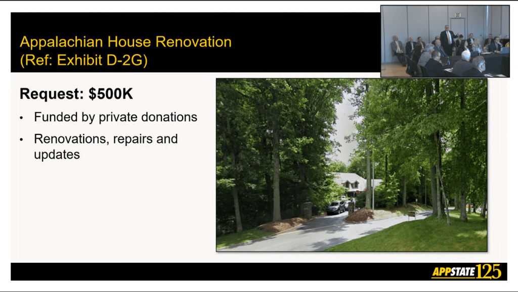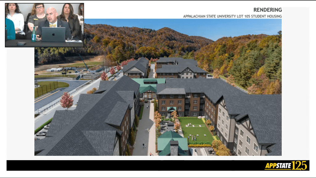 Presentation by JJ Brown of Student Affairs. Proposed student housing project at App 105 (old Watauga High School).
