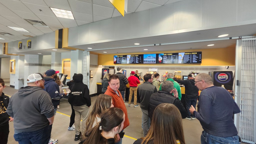 This can ensure more offerings than popcorn and premade chicken sandwiches, plus dedicated alcohol-serving areas and less pop-up cards that crowd the concourse. Also, there need to be snake-like lines at all concession stands, otherwise people will line up in a straight line to the back wall, creating bottlenecks like Kidd Brewer. These are avoidable.